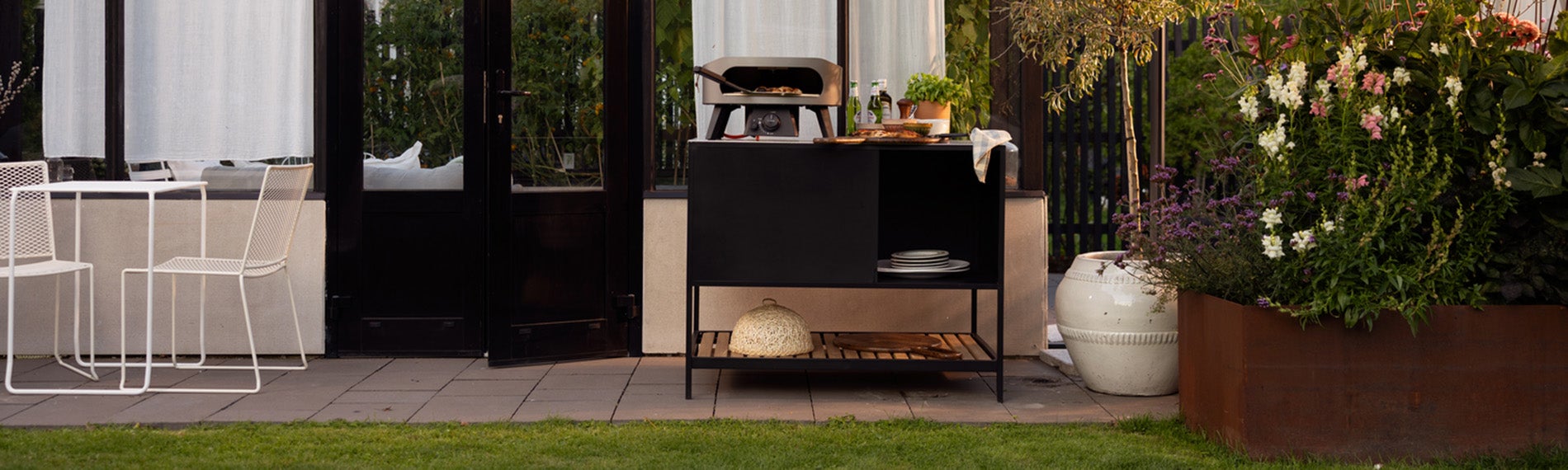 Geschaffen für Pizza. Bereit für mehr. Prep ist die perfekte Outdoorküche für Pizzaöfen und das Kochen im Freien. Die großzügige Arbeitsfläche besteht aus gebürstetem Aluminium, das kratzfest und leicht zu reinigen ist. Clevere Details wie Platz für eine Gasflasche und eine praktische Ablage darunter machen Prep sowohl funktional als auch stilvoll.