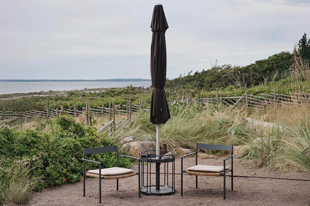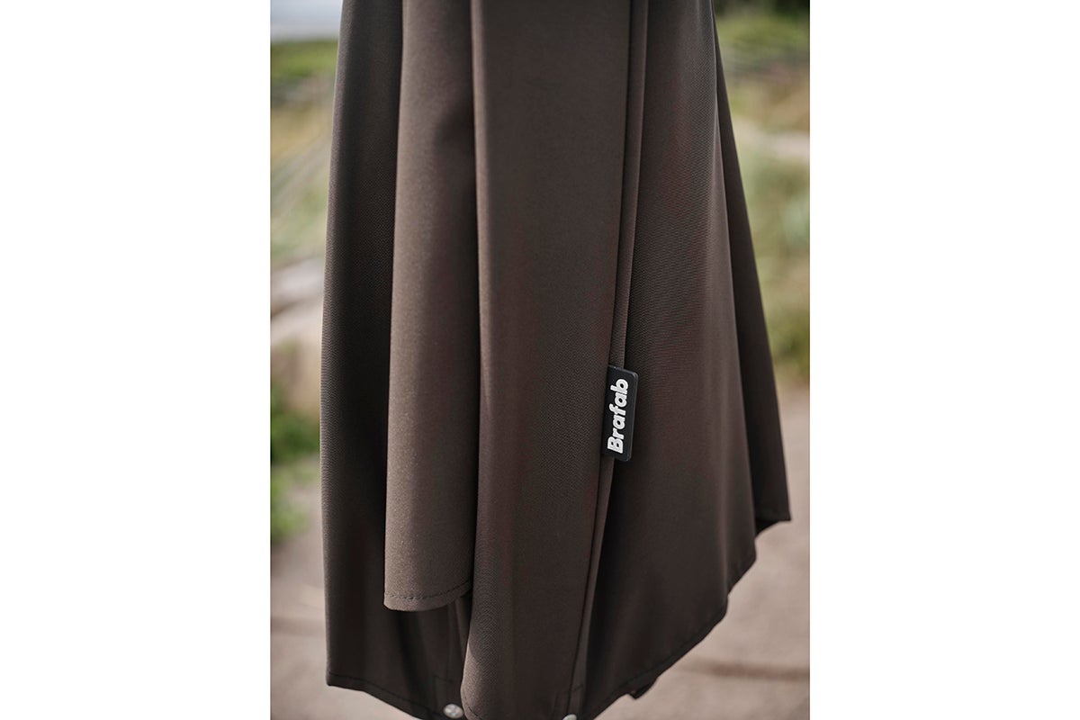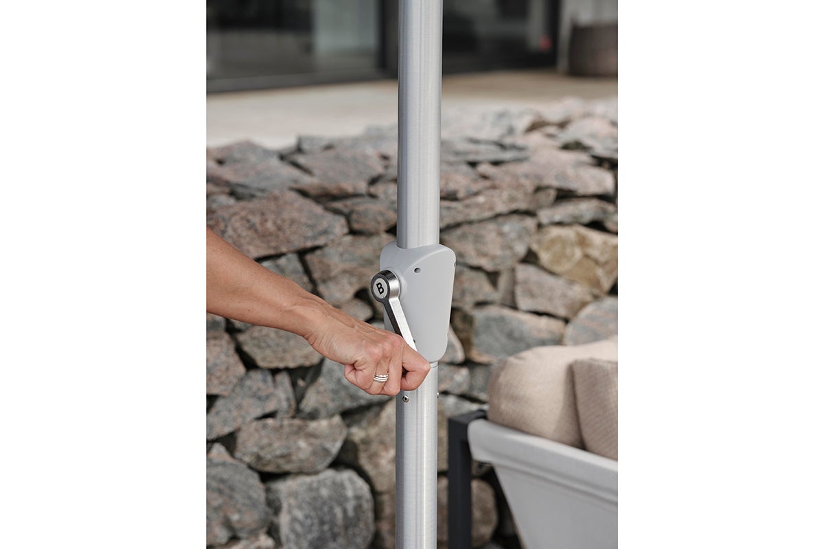 Abriola verfügt über einen silberfarbenen Aluminiummast in zwei Teilen mit einem Durchmesser von 48 mm. Der Mast ist mit einer Kurbel und einer automatischen Kippfunktion ausgestattet, sodass Sie den Sonnenschirm leicht neigen können. Das Dach besteht aus 250-Gramm lösungsgefärbtem Stoff, ist mit einer Lüftungsöffnung versehen und wird von 8 Streben gestützt.