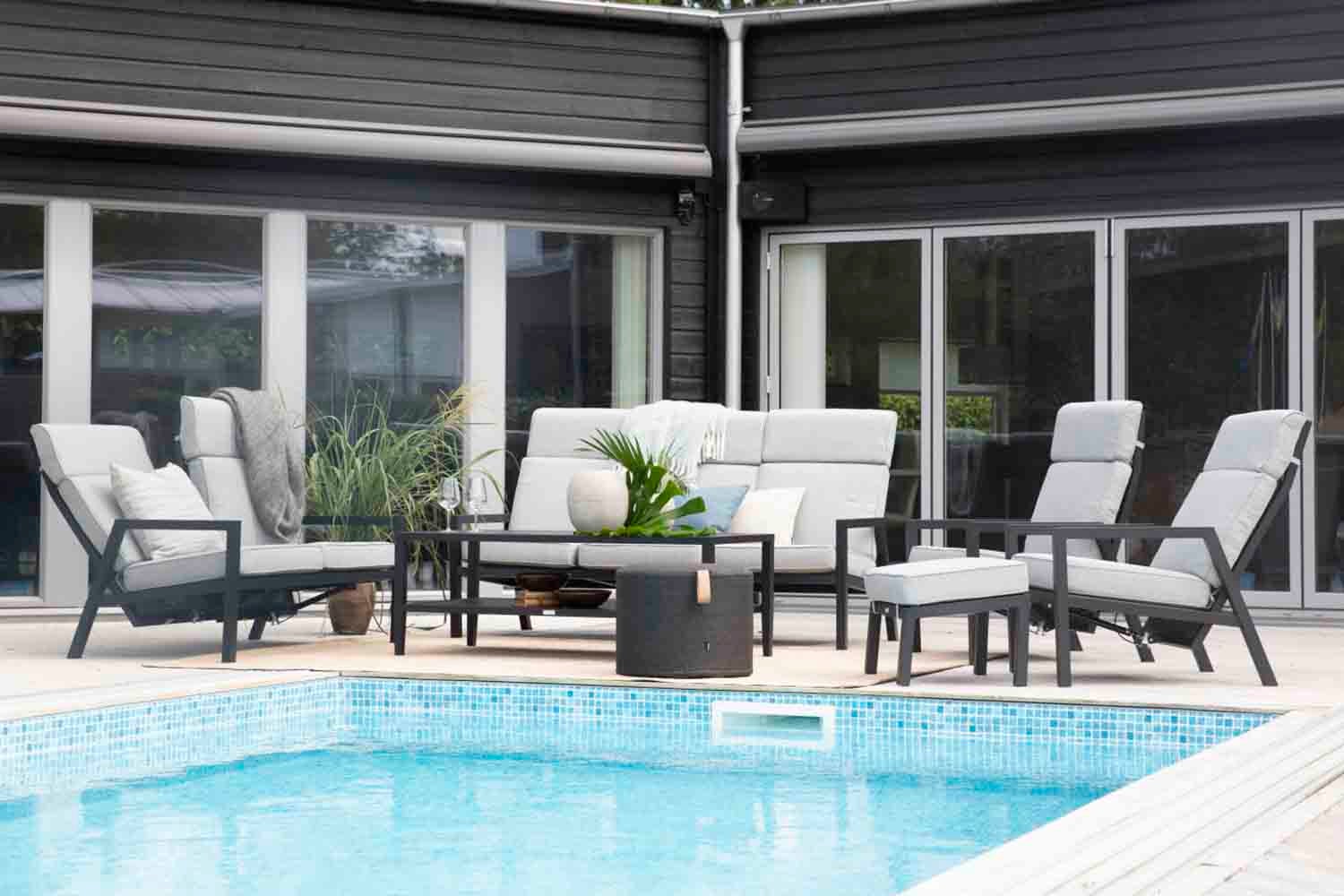 Eine moderne Loungeserie mit hervorragendem Sitzkomfort. Sie haben die Wahl zwischen weißem oder schwarzem Aluminium mit grauem Textilen. Die enthaltenen, hochwertigen Auflagen haben einen Bezug aus Olefin. Die Serie besteht aus mehreren Einzelteilen, die Ihnen die Möglichkeit geben, auf Ihrer Terrasse, egal ob groß oder klein, ein gemütliches und funktionelles Ambiente zu schaffen.