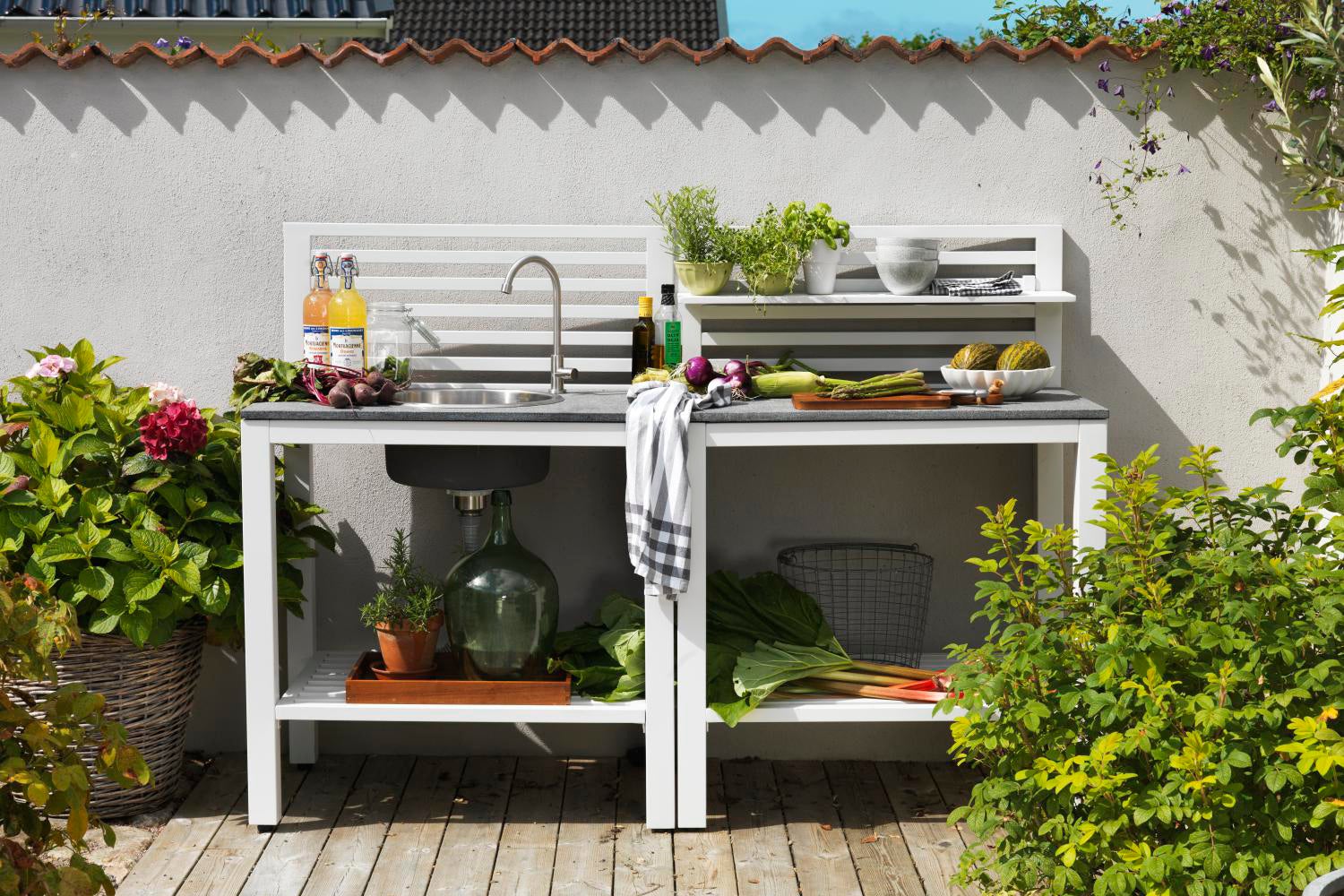 Laden Sie Ihre Freunde auf die Terrasse ein und bereiten Sie das Essen an Ort und Stelle vor! Die Bellac Outdoor-Küche in matt lackiertem Aluminium mit Granitarbeitsplatte macht es möglich. Armatur und Becken aus Edelstahl.