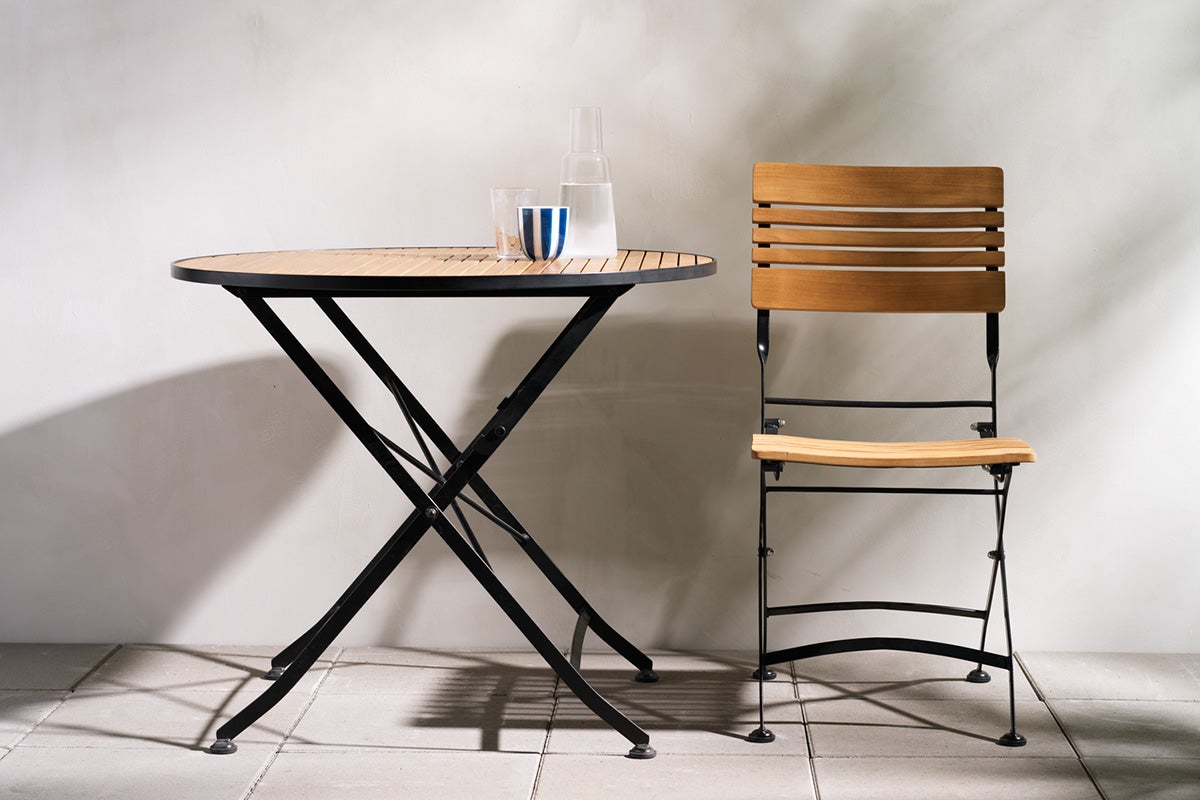 Eine klassische Bistro-Serie mit zeitlosem Café-Charme. Hergestellt aus langlebigem, schwarz pulverbeschichtetem Stahl mit glatten Teakholzrippen. Brewer ist faltbar, nimmt wenig Platz ein und passt auf den Balkon genauso gut wie auf die Terrasse.