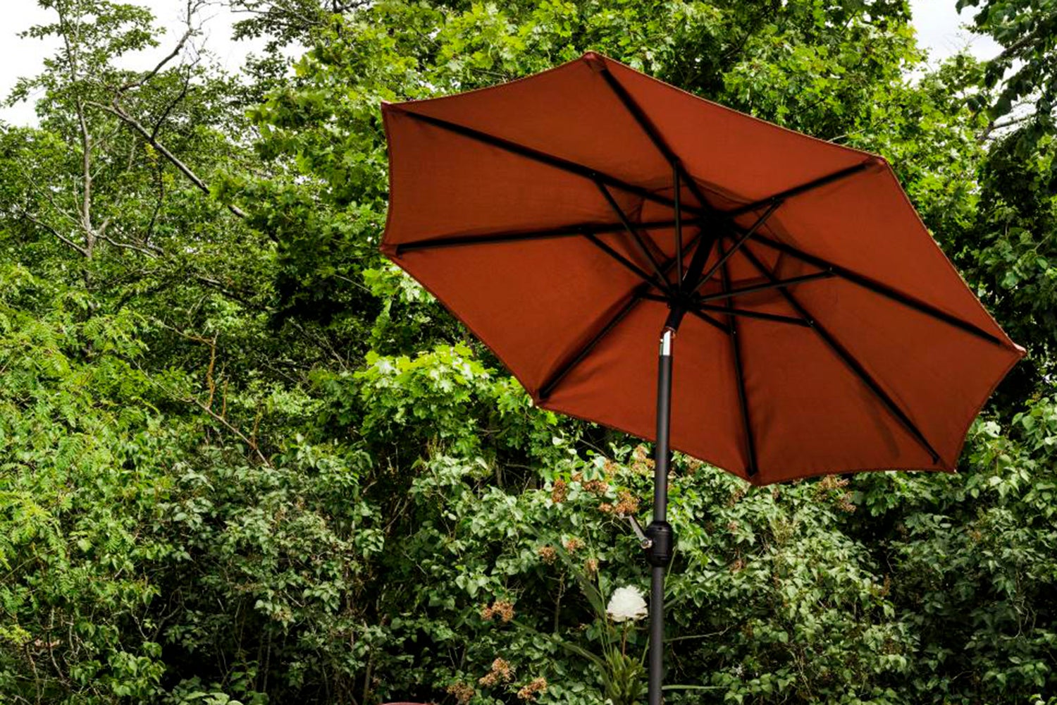 Sonnenschirm mit zweiteiligem Holm aus Aluminium und acht Stahlstreben. 200 g starkes Polyestergewebe mit Ventilationsöffnung. Kurbelfunktion.
