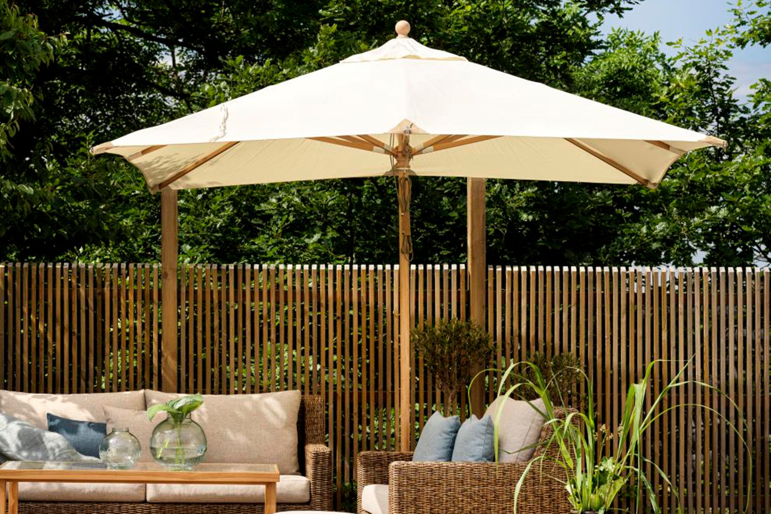 3x3 m Sonnenschirm aus FSC-zertifiziertem Holz (Sycamore) mit einer matt lackierten Oberfläche. Schöne Lederverstärkungen an den Enden, Bespannung aus 250 g Polyestergewebe.