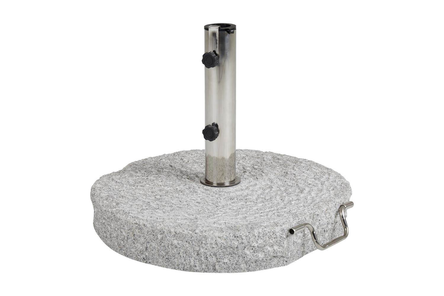 Granitfuß in zwei unterschiedlichen Farben/Oberflächen mit rostfreiem Stahlrohr. Beide Größen haben einen Handgriff, und das 70 kg Gewicht ist zum leichteren Transportieren mit zwei Rollen ausgestattet. Für Stangen mit Durchmessern von 35–54 mm.