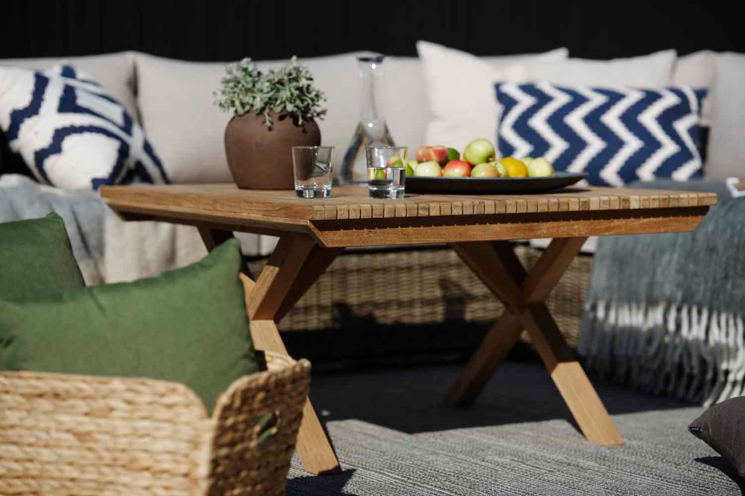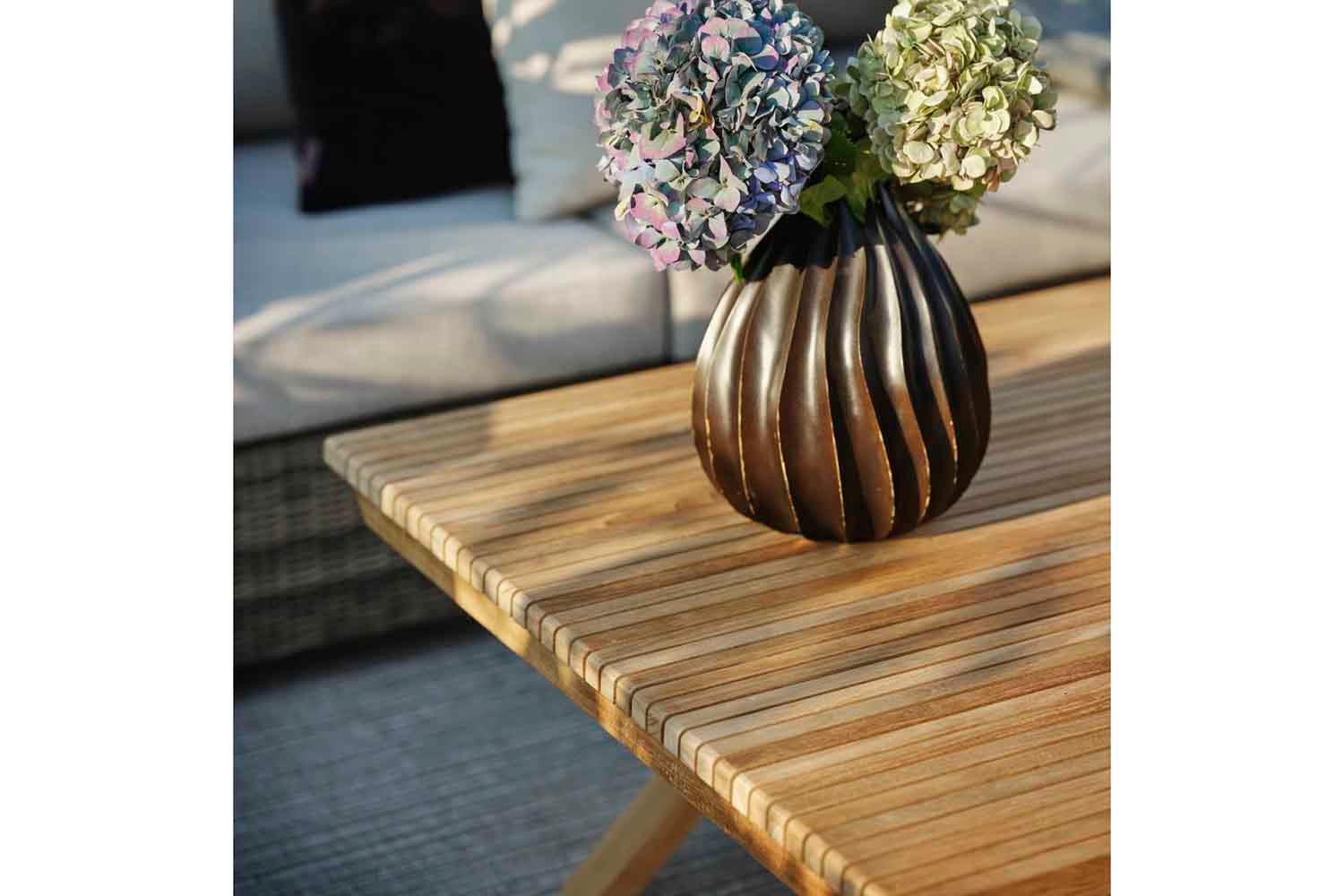 Eine hochwertige Serie mit quer verlaufenden Teakholzrippen als durchgängiges Element. Julita nimmt die Geradlinigkeit des skandinavischen Designs auf und schafft einen gemütlichen Essbereich, der durch seinen Stil auffällt und sich gleichzeitig in die Umgebung einfügt.