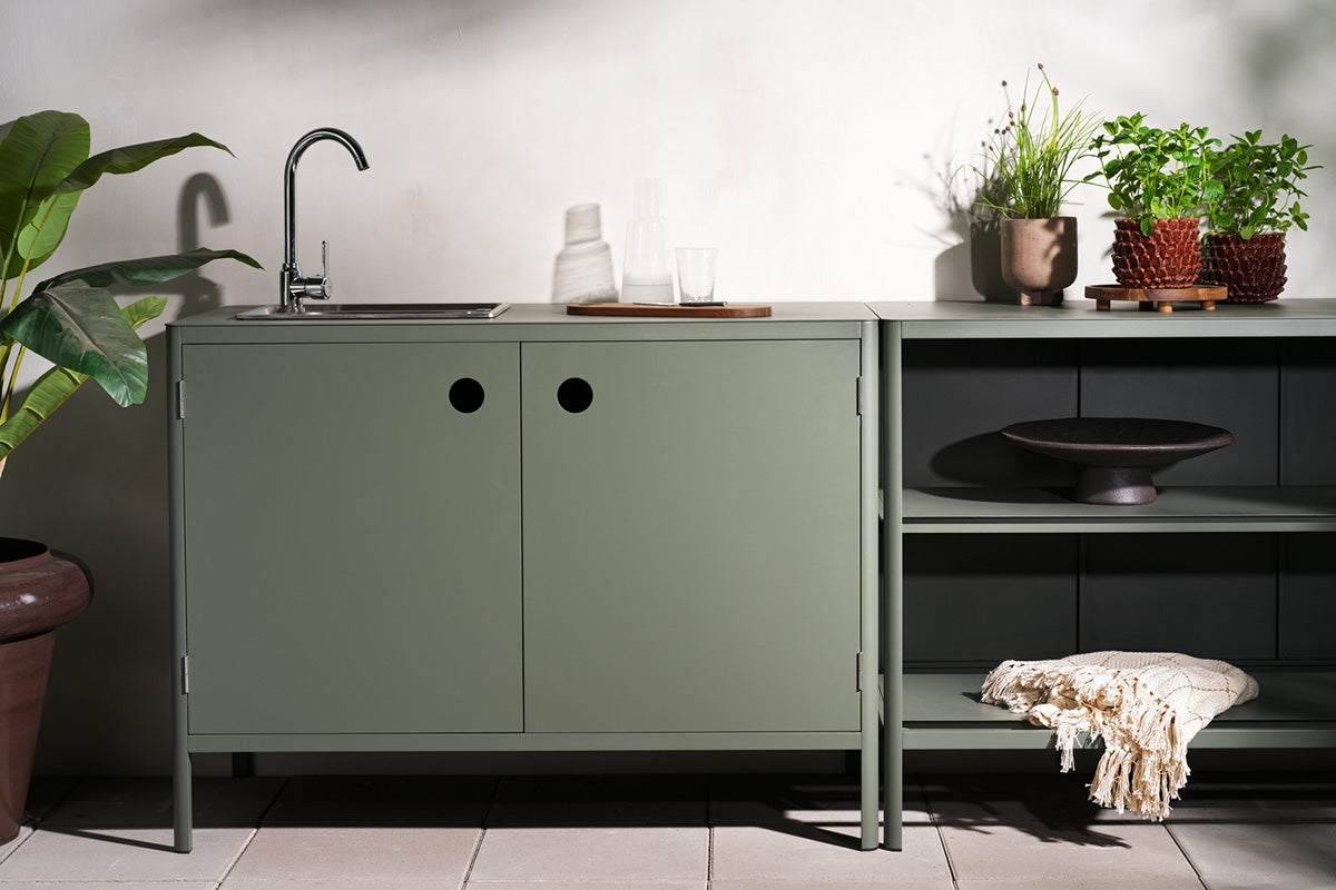 Kochen, aufbewahren und genießen – im Freien. Mit Kelia können Sie Ihre perfekte Outdoor-Küche zusammenstellen: intelligent, stilvoll und immer bereit für das Kochen im Freien. Und für alle, die gerne gärtnern, eignet sie sich genauso gut wie eine praktische Anbaubank. Großzügige Arbeitsflächen und eine durchdachte Ablage erleichtern das Zubereiten und Servieren. Die Serie ist in drei Varianten erhältlich – mit Türen, mit Spüle und Armatur oder mit offenem Regal – die alle optimal zur Delia-Kollektion passen.