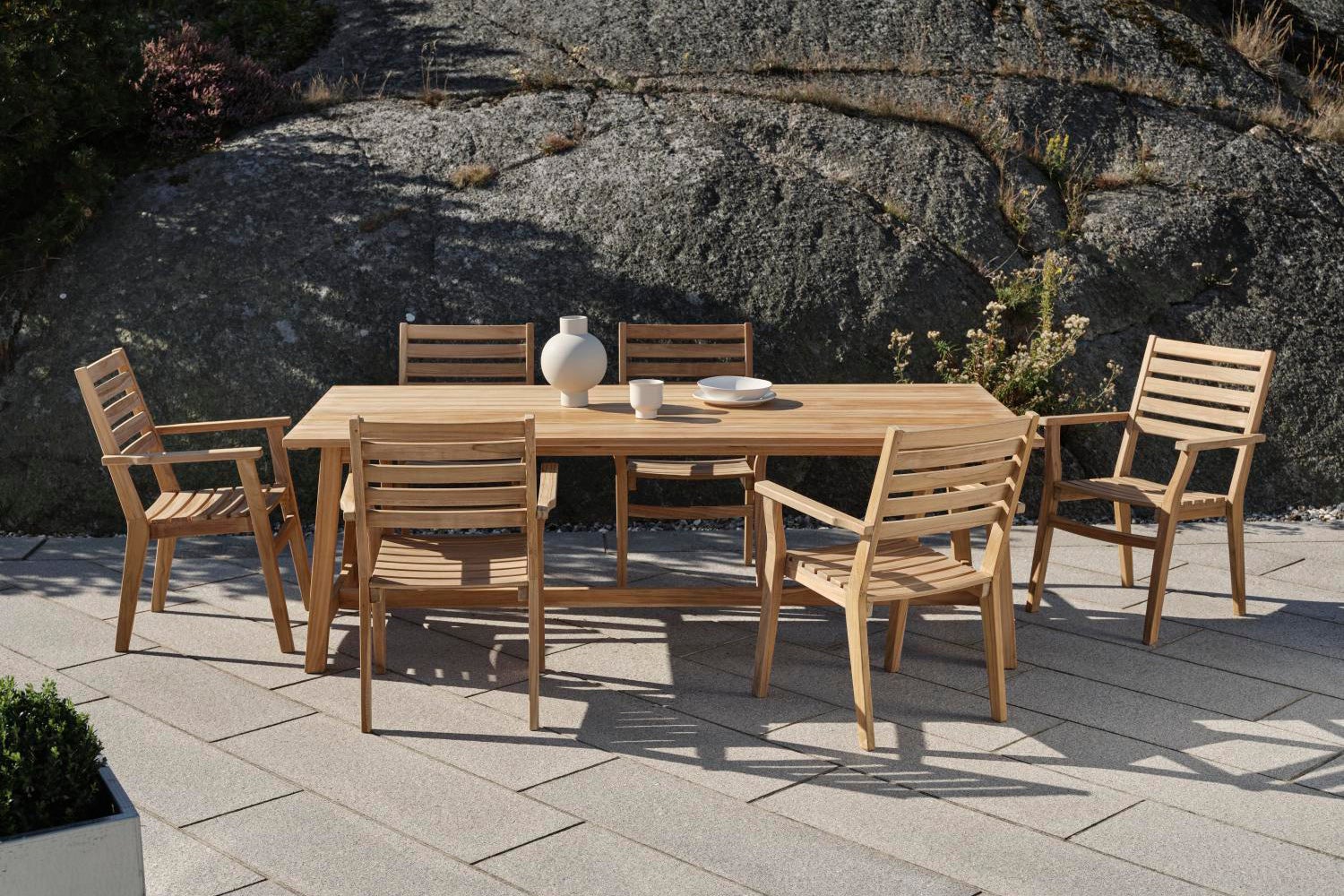 Ein serie in schlichtem, natürlichem Teak. Harmonische Form und bequeme, geformte Sitzfläche. Einfach zu bewegen – ideal, wenn Sie einen zusätzlichen Sitzplatz am Tisch benötigen.