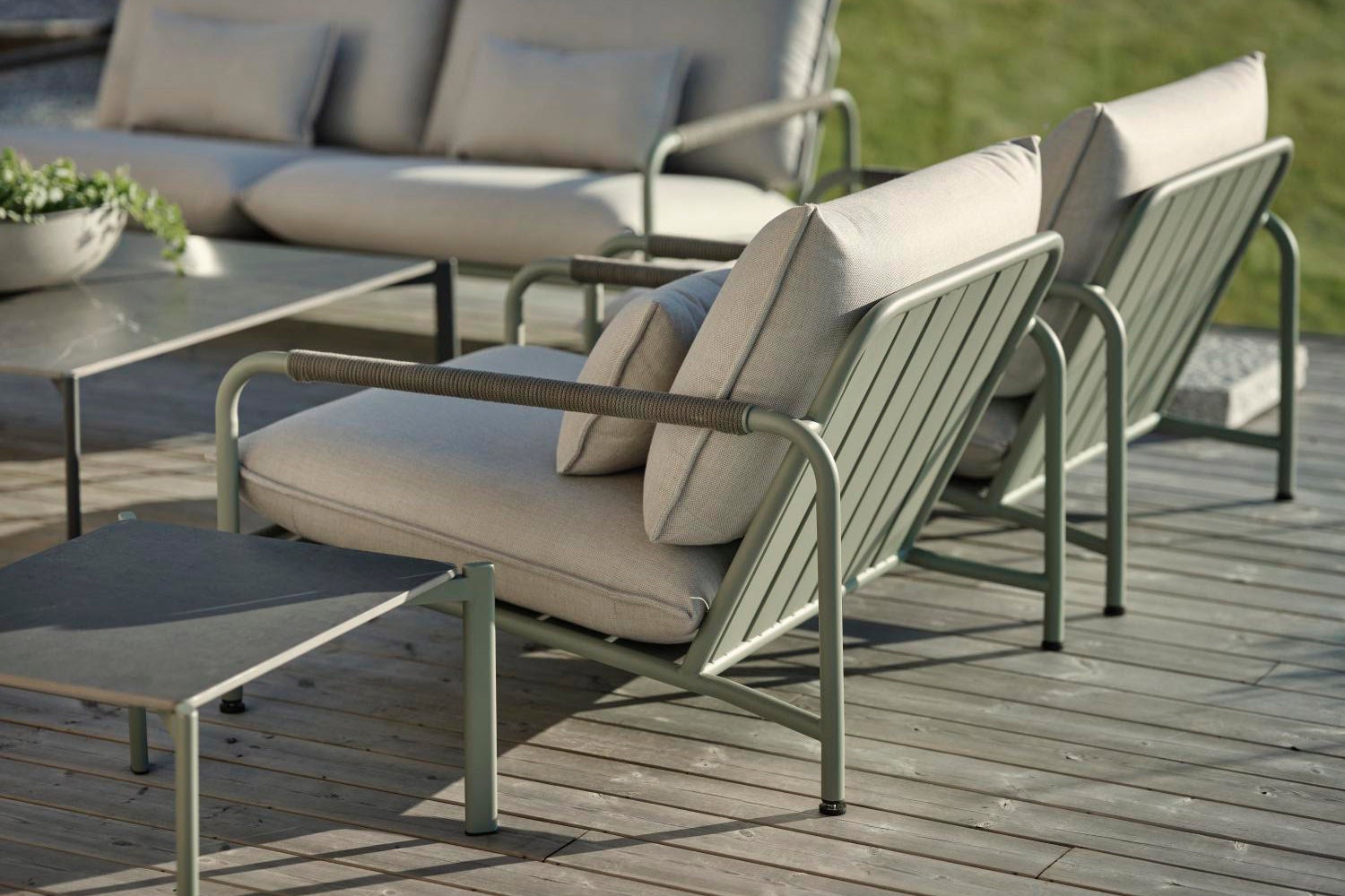 Lerberget ist eine Premium-Serie, die sowohl in Qualität als auch im Design außergewöhnlich ist. Wenn die besten Materialien in jedem Detail auf durchdachtes Design treffen, haben Sie ein Sofaset, das nicht nur die Aufmerksamkeit anzieht, sondern auch bequemer sitzt als je zuvor. Edelstahlrahmen in zwei nüchternen Tönen, breite dekorative Latten unter extra bequemen Kissen und schöne Details in den Armlehnen – diese Gruppe sieht auf jeder Terrasse perfekt aus.