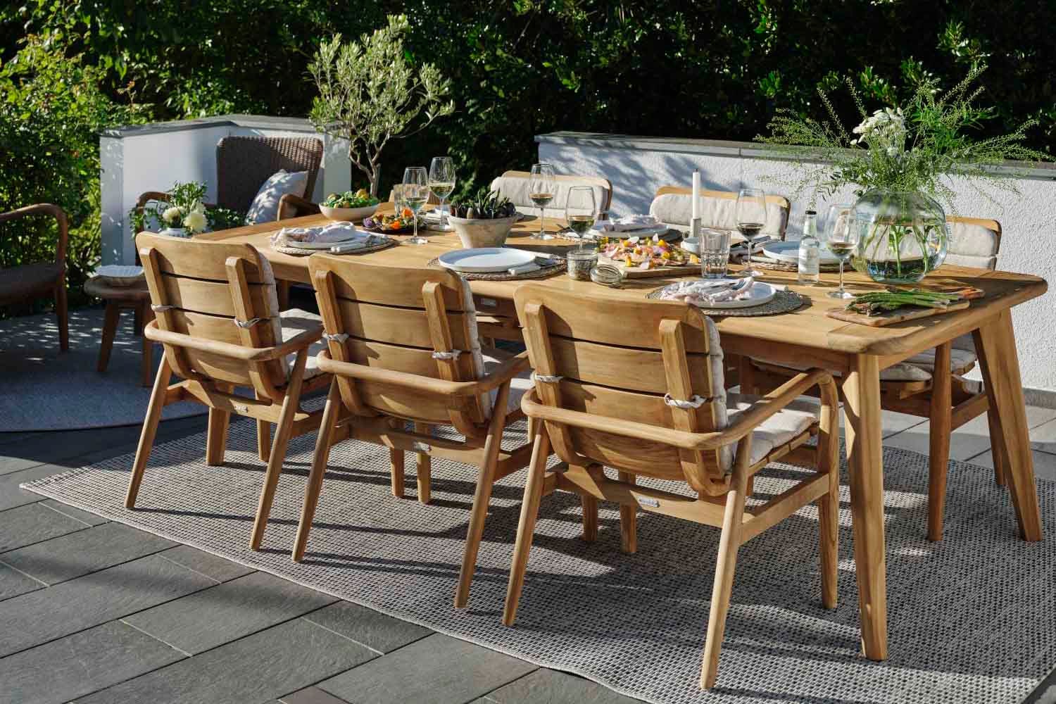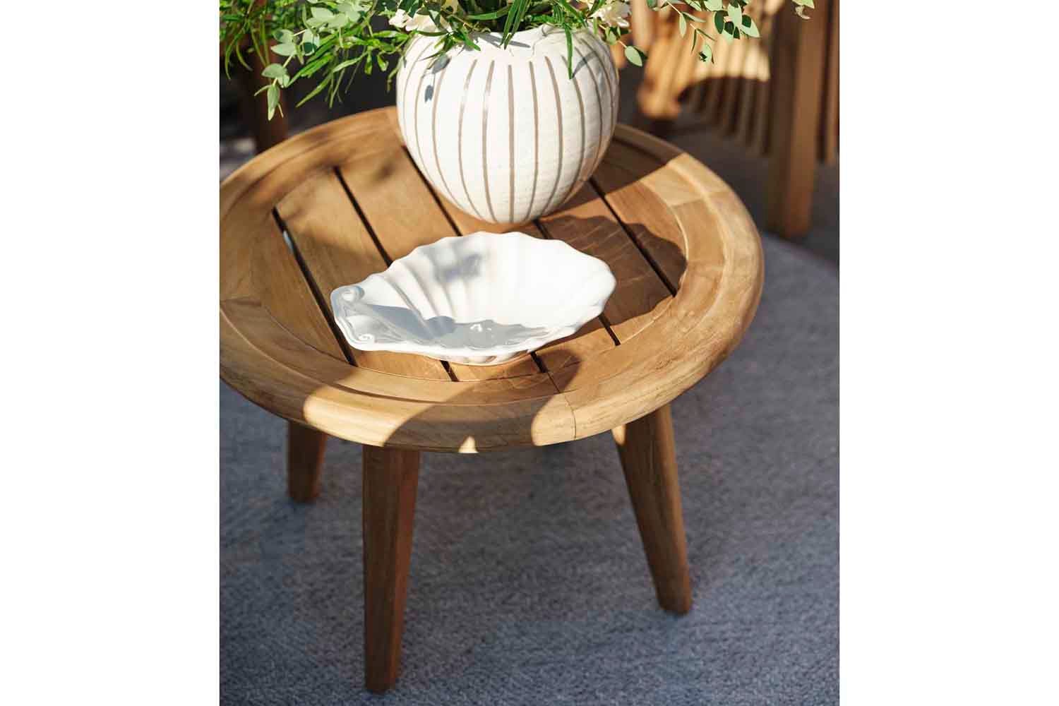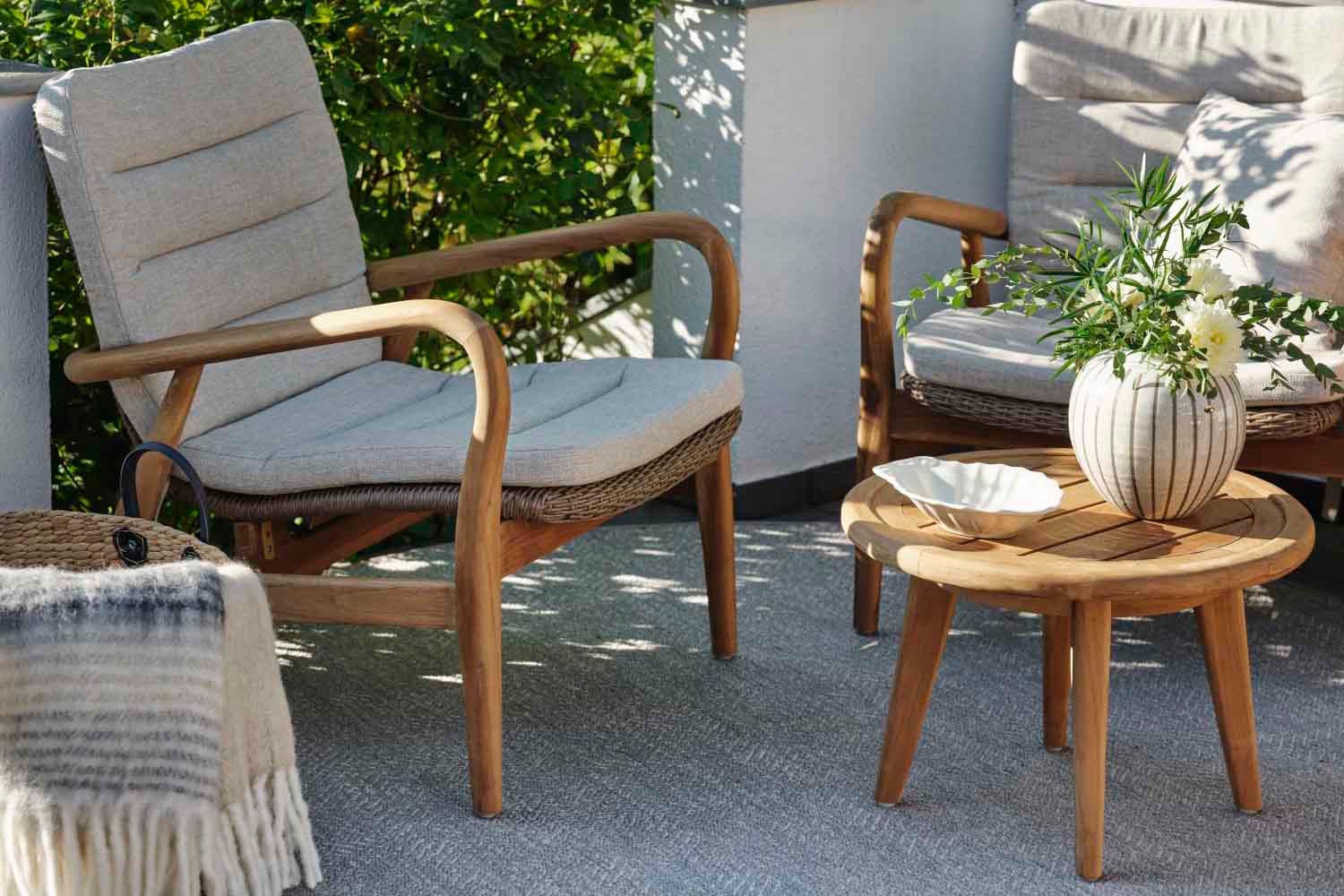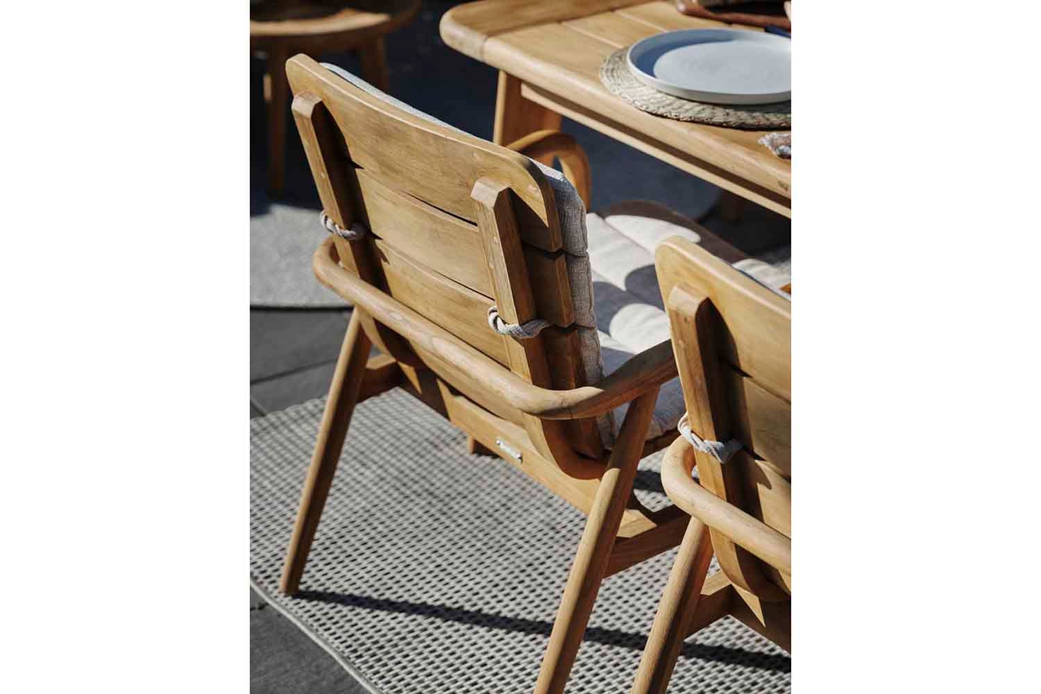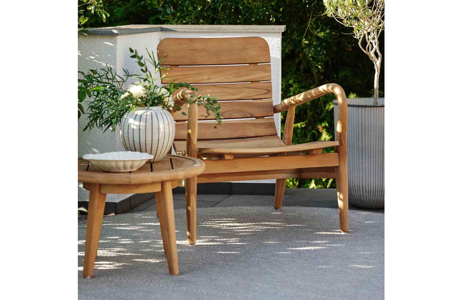 Lilja ist eine Gruppe, die sowohl zum Entspannen als auch als Essgarnitur geeignet ist. Aus Teakholz in runder, organischer Form. Die Teile sind robust und strahlen durch ihre abgerundete Form Eleganz aus.