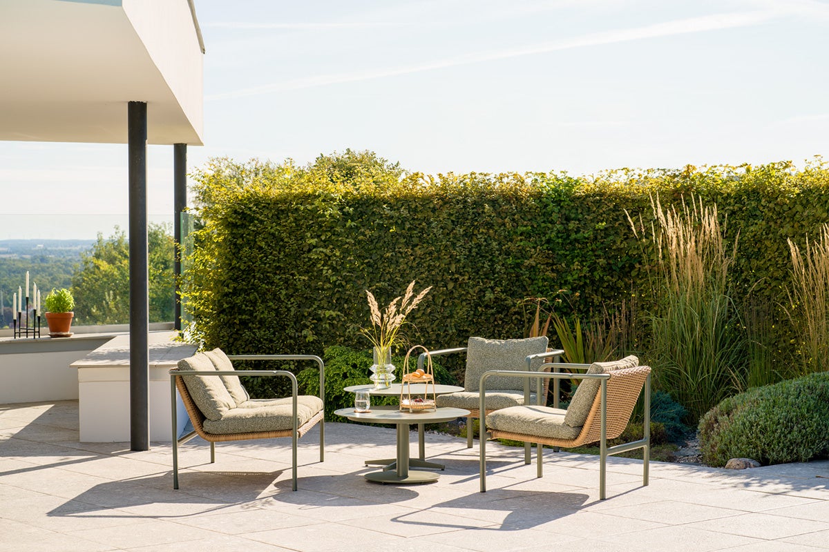 Weiche Formen und eine natürlich inspirierte Rattan-Optik verleihen Motty sowohl Komfort als auch Stil. Die Serie ist in den Farben Zin Red, Nordic Green und Black erhältlich. Das pulverbeschichtete Gestell hat weiche Übergänge an den Gelenken und Armlehnen, was den eleganten Look noch verstärkt. Weiche Teddy-Stoffkissen vervollständigen das Gefühl und machen den Motty ebenso einladend wie bequem.