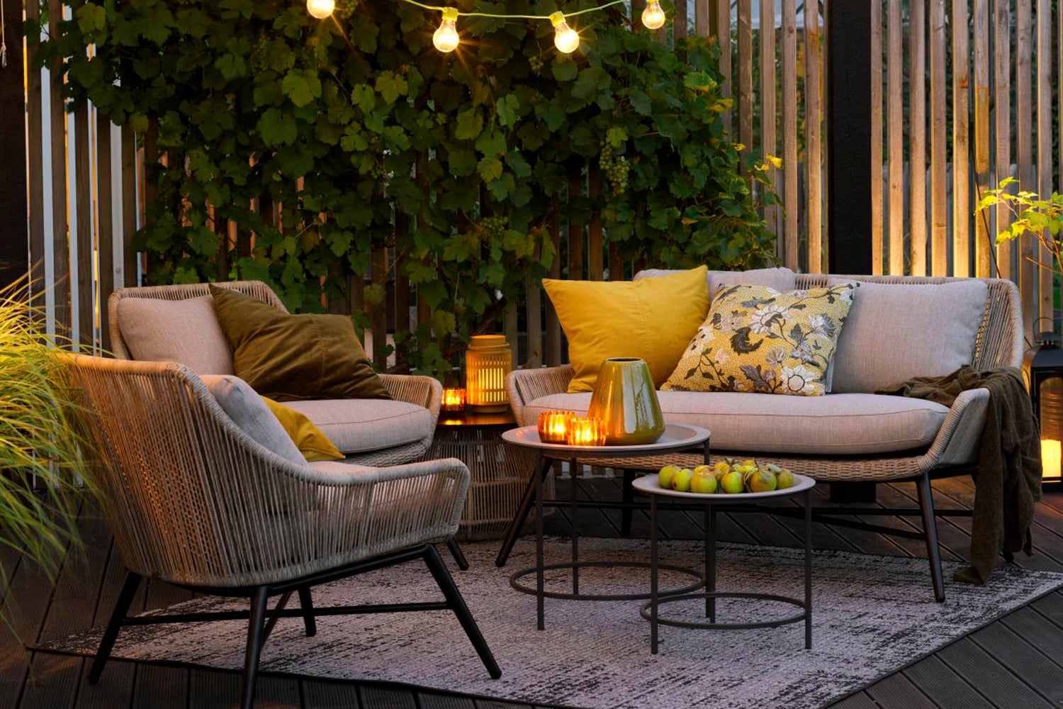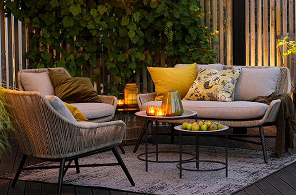 Sofagruppe mit modernen, runden Formen aus Kunstrattangeflecht. Kombinieren Sie gerne mit Tischen aus unserer Pamir-Serie.