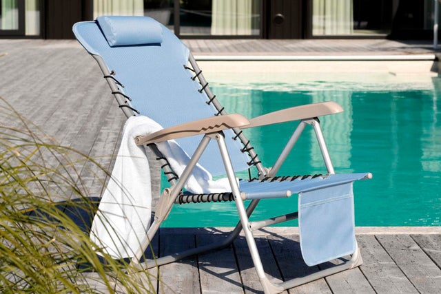 Leichter, stabiler Strandstuhl mit Aluminiumrahmen und robustem Polyester. Fronttasche.