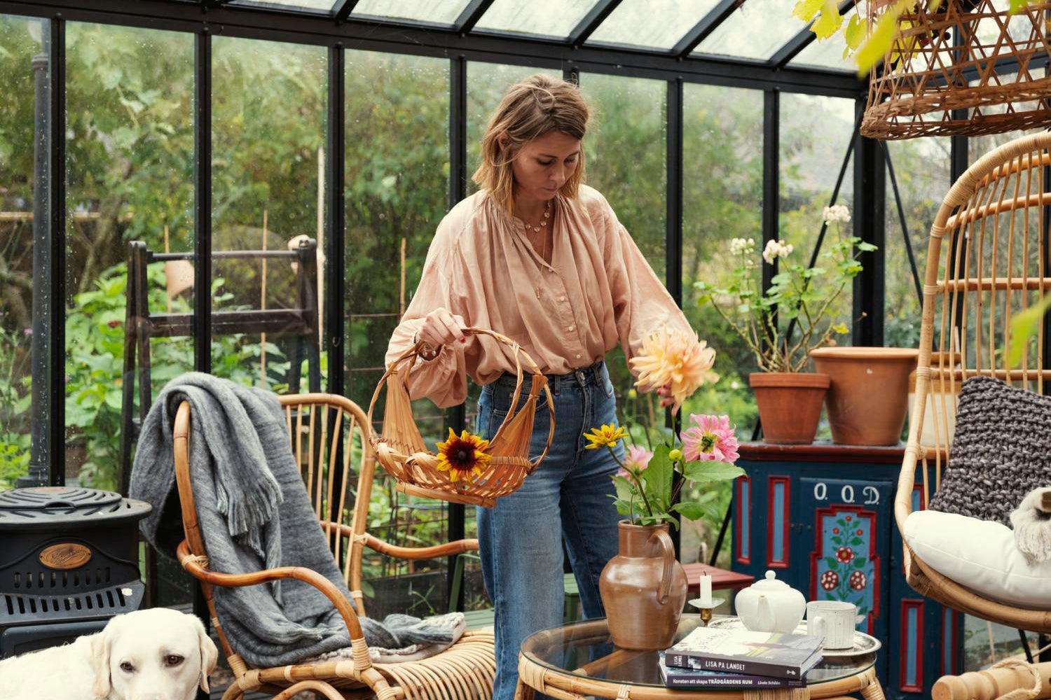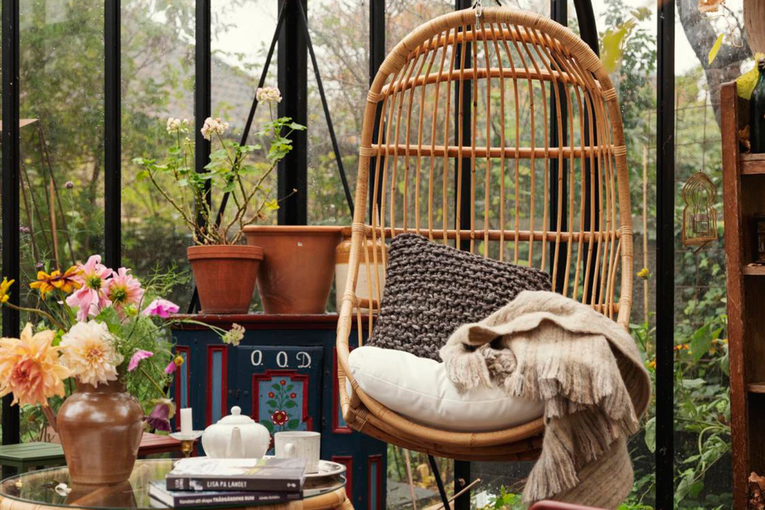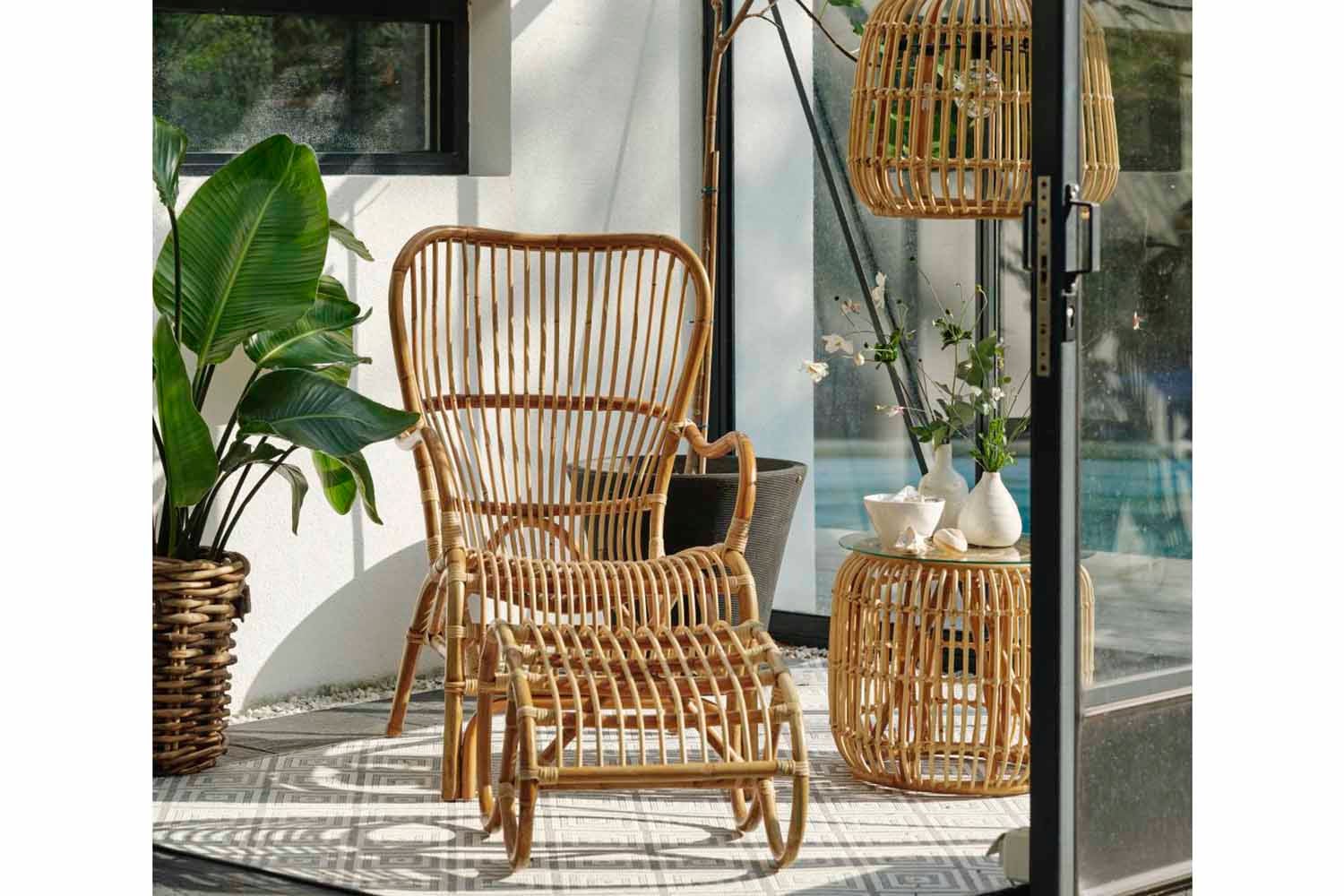 Vallda ist eine Reihe von Stühlen, Tischen und einer hängenden Schaukel aus natürlichem Rattan mit feinen Details.