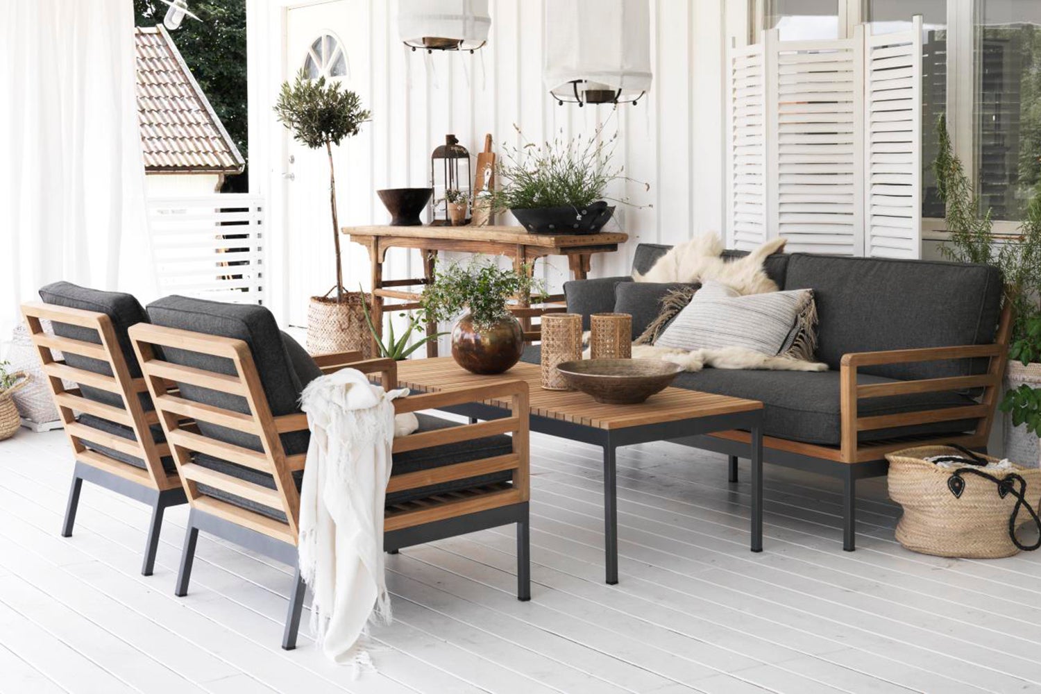 Grazile Sofalounge Gruppe in der hochwertiges Teakholz mit anthrazit pulverbeschichtetem Aluminium kombiniert wird. Die grade Teaklattung verstärkt die Anmut und die Eleganz. Die Kissen sind bei Zalongo inklusive.